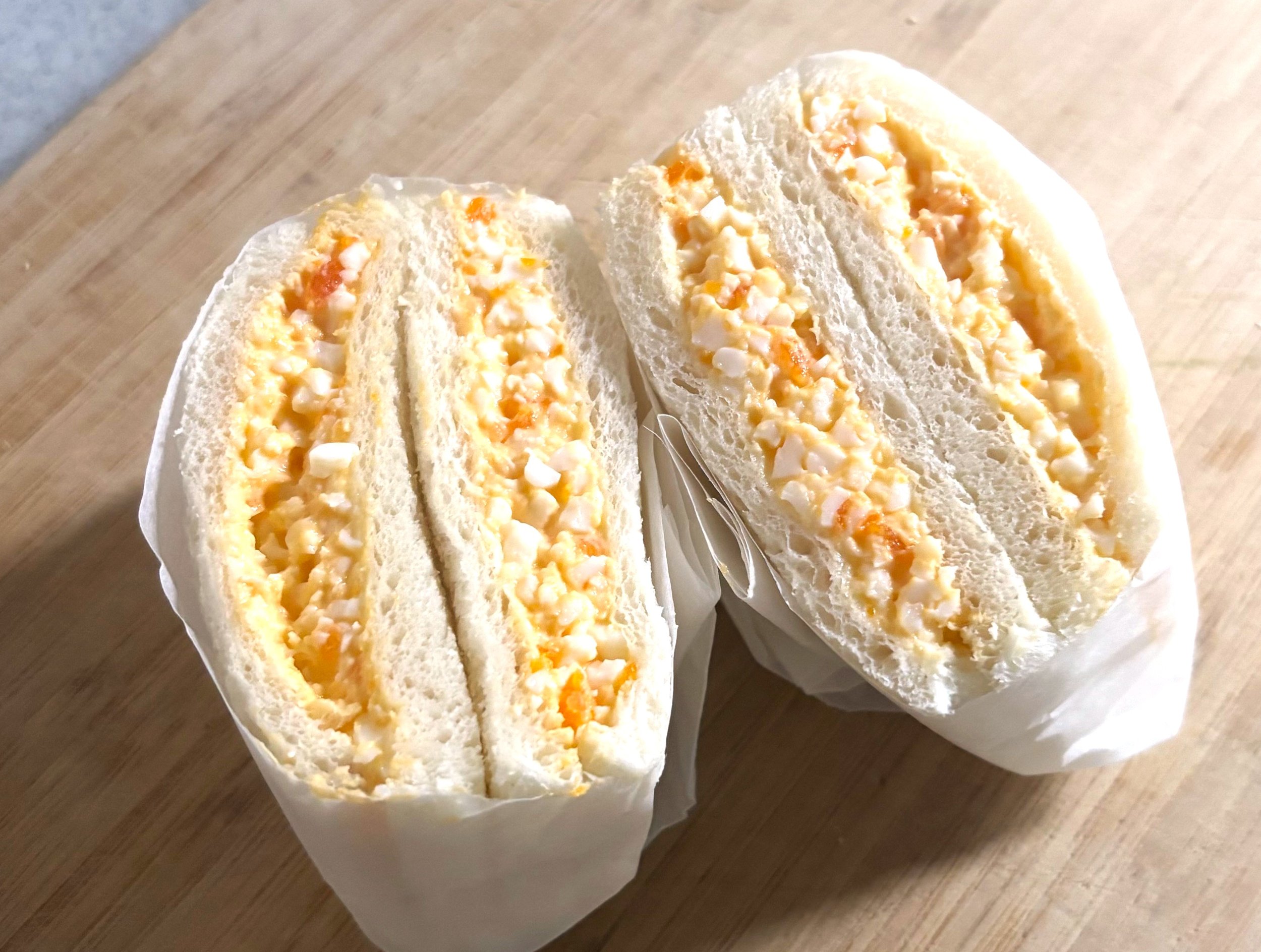It features a rich egg salad made with basic ingredients, sandwiched between fluffy white bread.