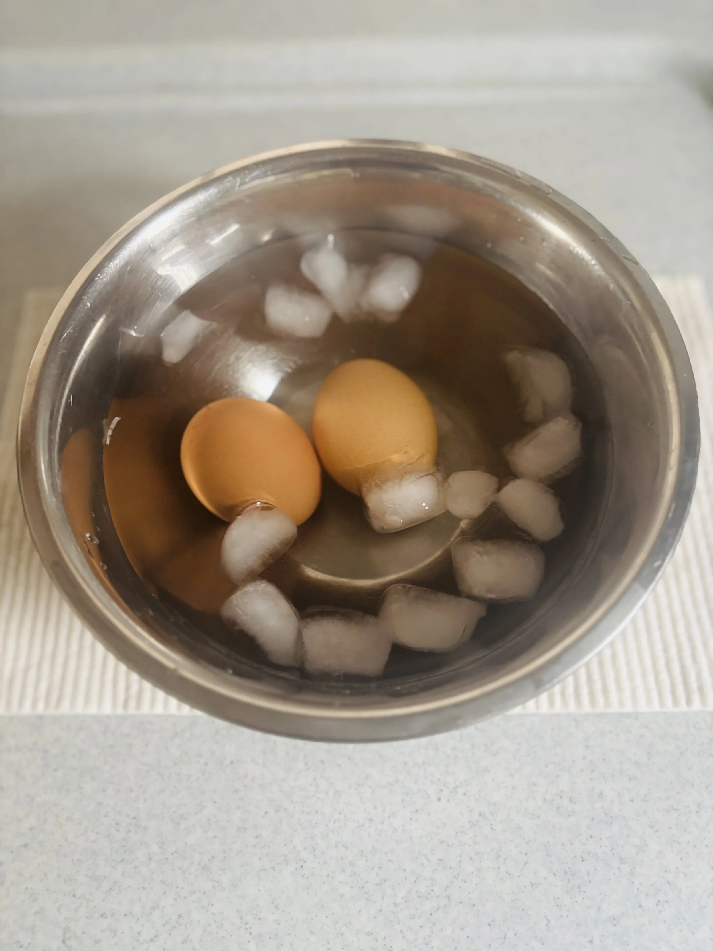 Cool the eggs in ice water and peel the shells.
